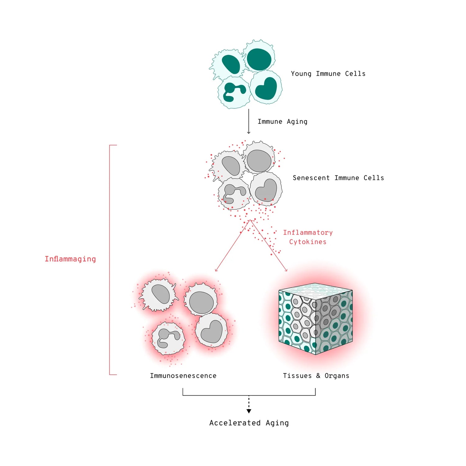 As we age, the balance of immune cells shift toward pro-inflammatory cell types, including senescent immune cells that cease to replicate and secrete inflammatory molecules, contributing to a phenomenon known as “inflammaging.” Inflammaging is one of the 12 hallmarks of aging.