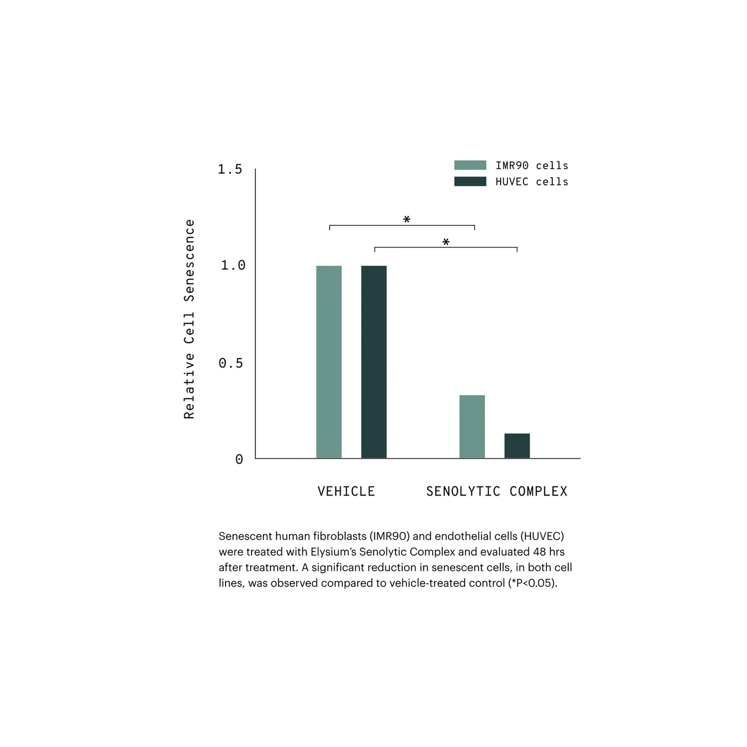 Based on cutting-edge research in cell senescence, the Senolytic Complex is proven to clear pro-inflammatory senescent cells in human cell lines. It contains potent senolytics that target senescent cells, boost muscle recovery and endurance, and support cellular rejuvenation. Taken monthly, this “hit-and-run” approach aids in reducing the body’s burden of senescent cells.
