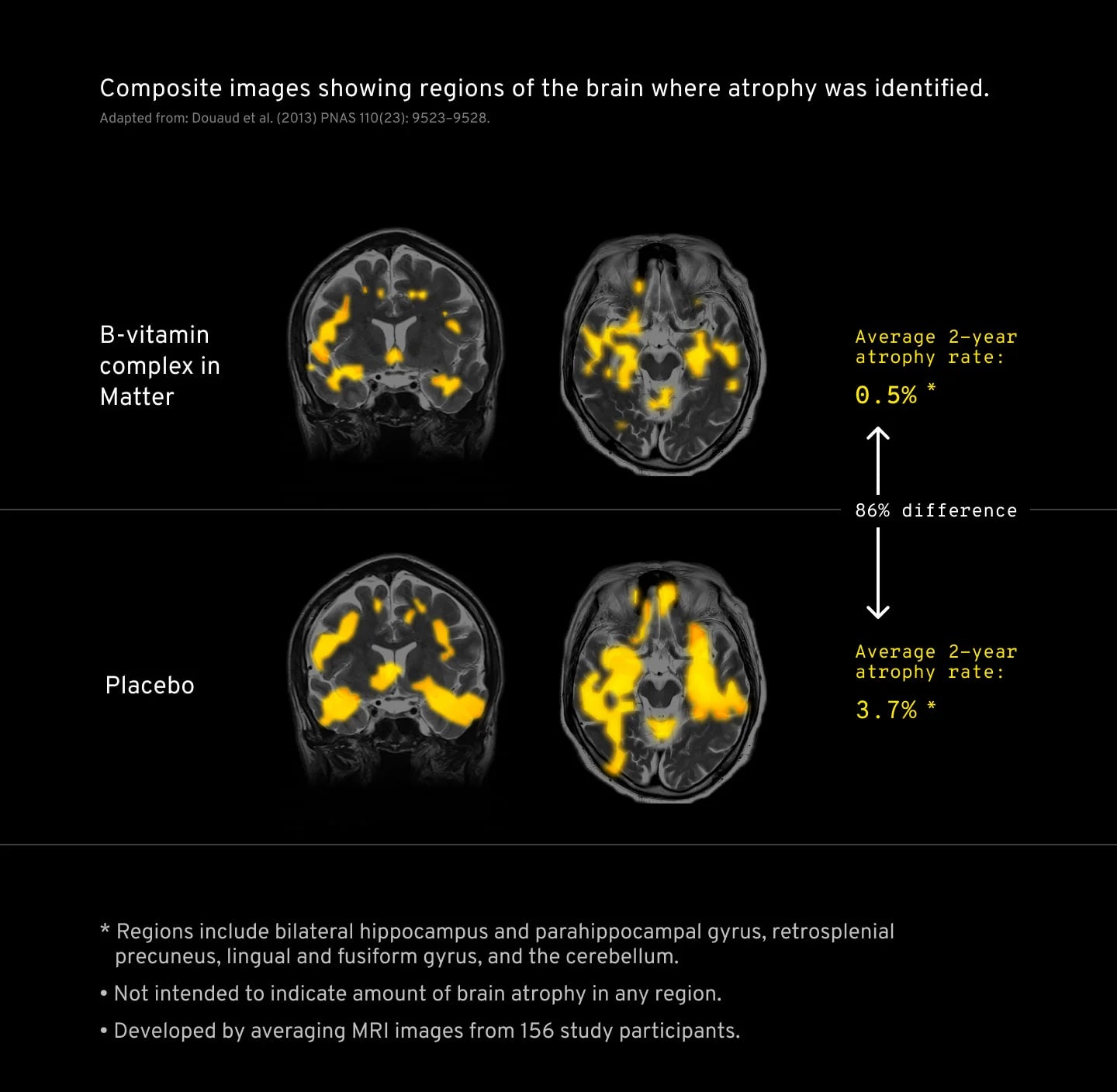 Matter contains the exact doses of vitamin B6, folic acid, and vitamin B12 that were shown to be efficacious at slowing age-related brain atrophy associated with mild memory concerns in the VITACOG study.